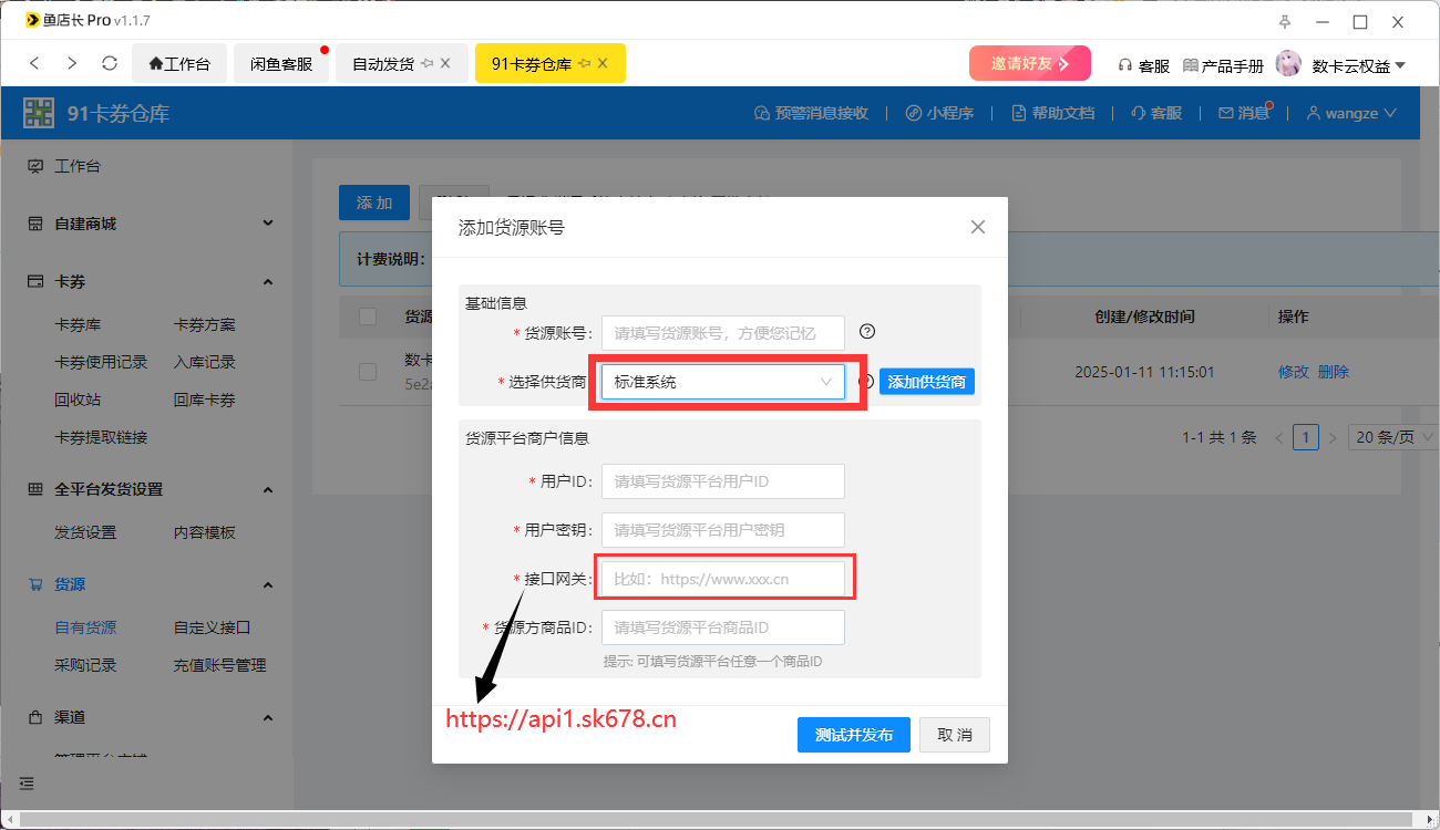 打开91卡券仓库—自有货源—添加—货源账号:自行起一个方便记忆的名称—选择供应商:已添加的供应商,或标准系统—按下图填写参数信息—添加(或测试并发布)